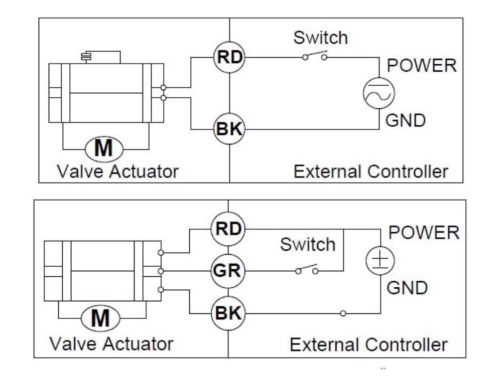 - 2-wire auto return (XR22): apply power to open, internal capacitor charges, on power loss the valve returns to normal. Allow at least about 60 seconds of power to maintain return capacity. See the XR wiring PDF. (Our electric ball valves are normally closed by default, but can be converted to normally open, so it would be better to say “apply power to change the valve position. On power loss, the capacitor drives the valve back to its default position.”)